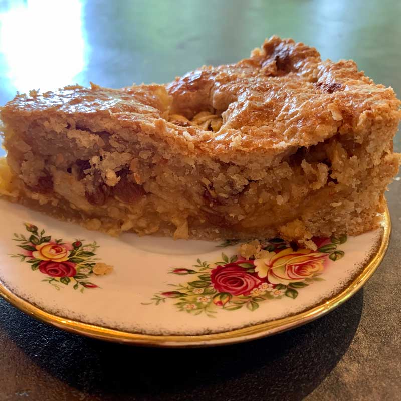 Hemelse smaak van warme appels met kaneel. Gezoet met kokosbloesemsuiker, thompsonrozijnen, een vleugje custard en zo’n lekkere dikke korst.