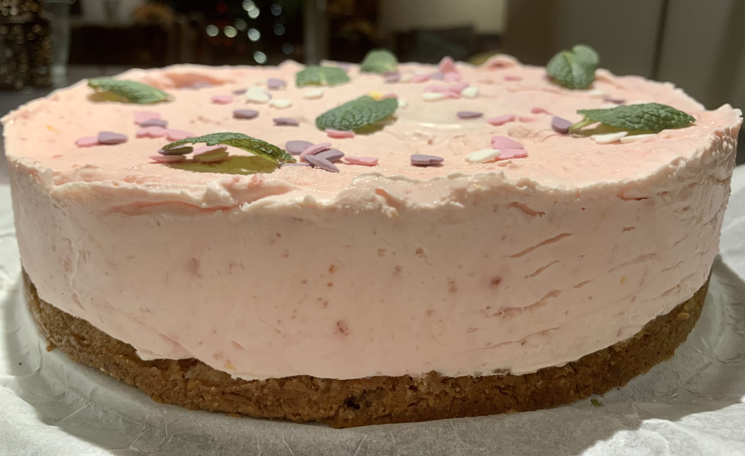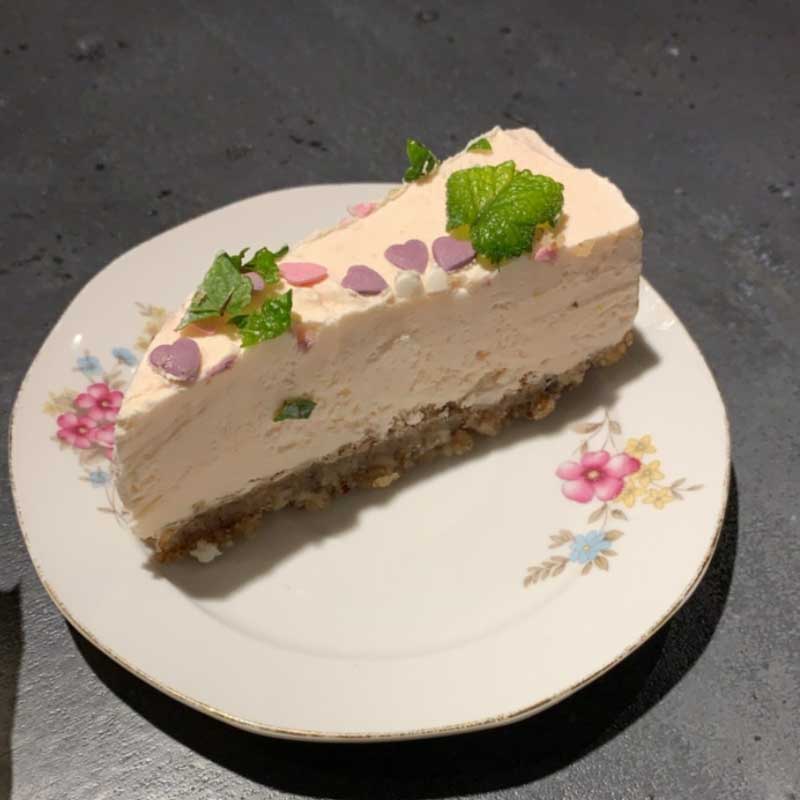Dit taartje moet in het assortiment. Zij is ohzo lekker! Op basis van zelfgemaakte labneh, zalige room, gezoet met ahornsiroop en natuurlijk roze gekleurd door biet. Citroenrasp maakt deze taart overheerlijk. De bodem is lekker bros met pecannoten en amandelen.